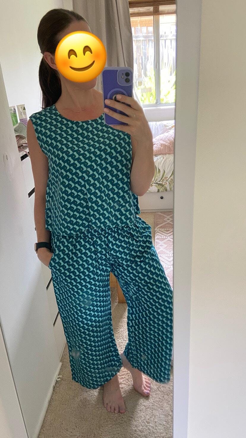 I’m not usually one for a matching set, I got this thinking I could pair the pants with a different top and vice versa, but as soon as I tried it on I love it! Fun print, great quality and the high waisted pants are so comfy! I got a size 10 and it’s true to size.
